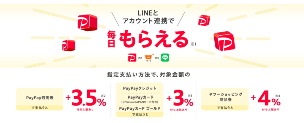 | 5のつく日 | 毎月5,15,25日 | PayPay系決済をすることで4%のポイント付与 |